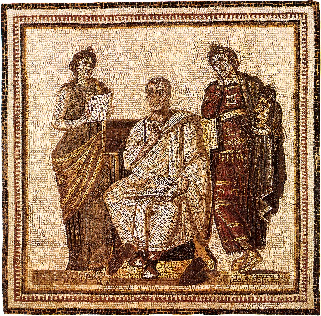 The poet Vergil and two Muses. Mosaic from Hadrumetum/Sousse. – Image source here