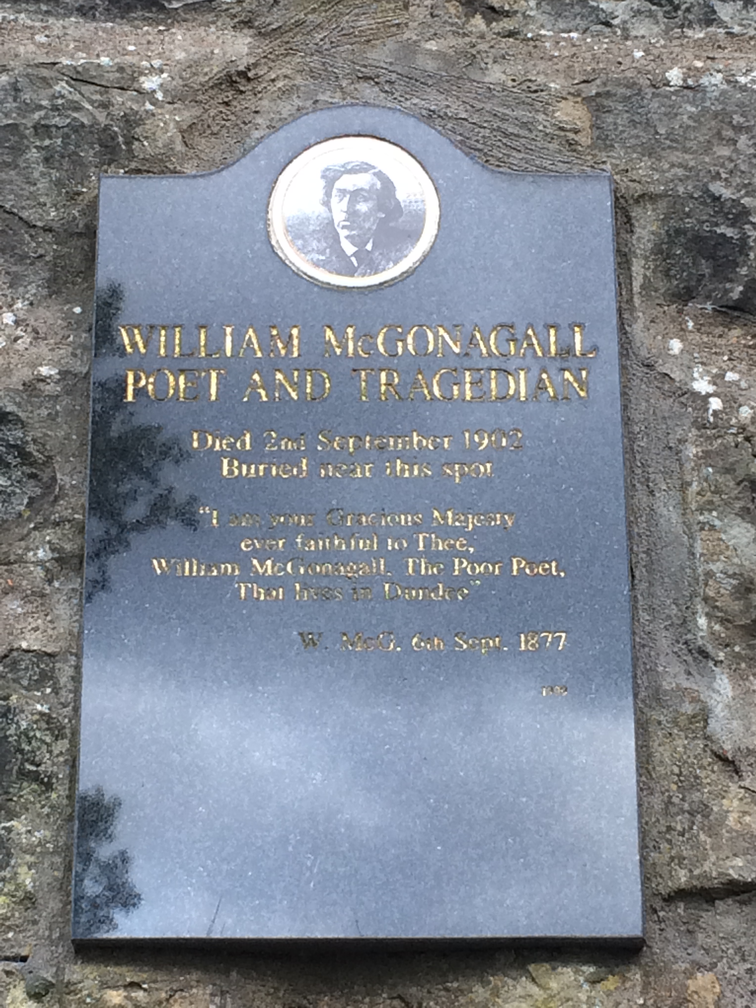 What convinced me, however, was the opportunity to pay tribute to one of my most favourite Scottish poets (de gustibus and such…), the multifariously (though perhaps not always – or even ever? – deliberately) outrageous William Topaz McGonagall (d. 1902), who was buried there in an unmarked grave, and more recently was honoured with a commemorative plaque: