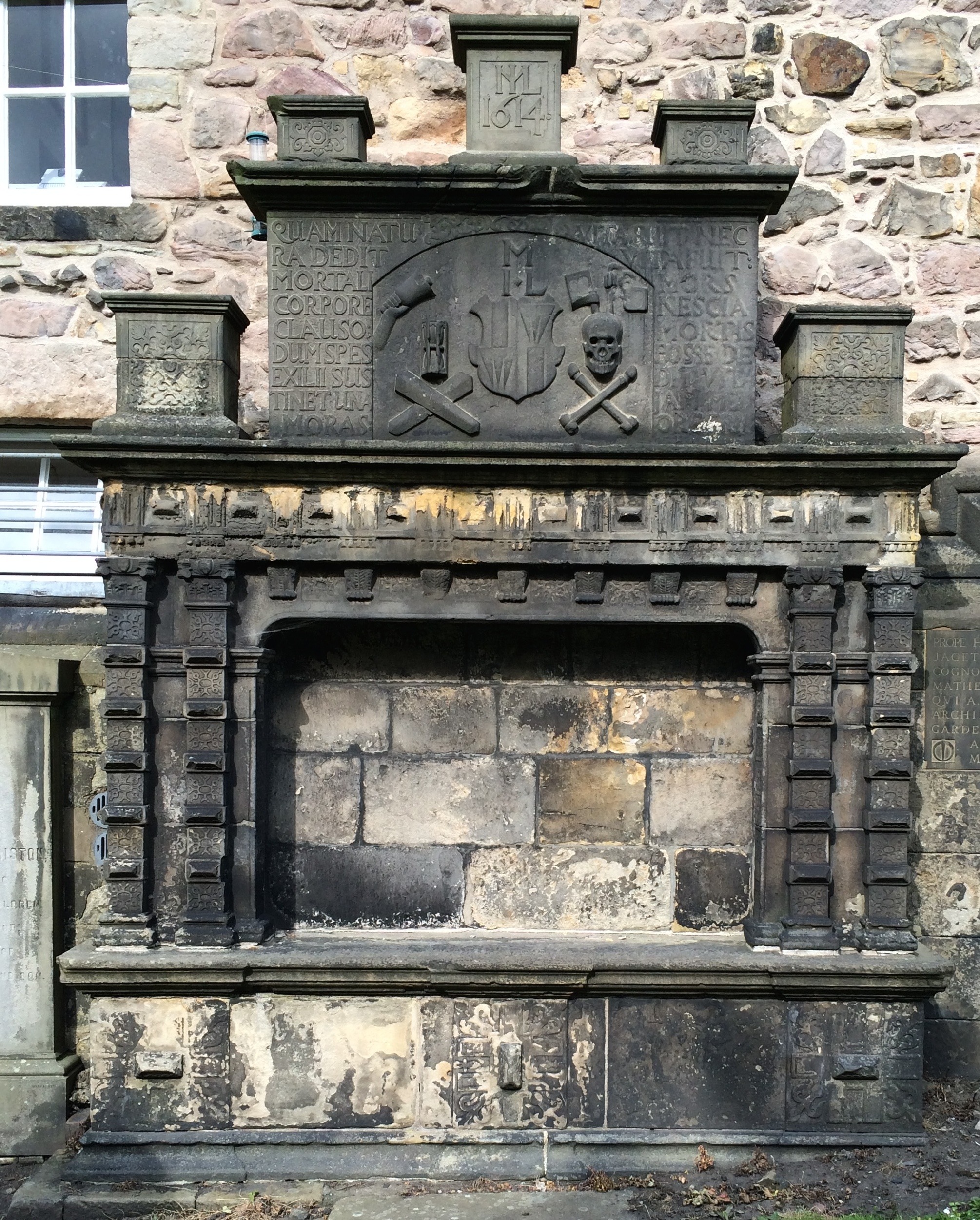 Both monuments are similar in size, shape, and design – representing altar tables with modest, sculpted reredoses – and they both date to roughly the same time period, namely the 1610s, during the reign of King James VI and I. In addition to their similar overall appearances, the two monuments, affixed to the kirkyard’s eastern wall (by Candlemaker Row), also have in common that they exhibit – in a comparable arrangement – short Latin epigrams.