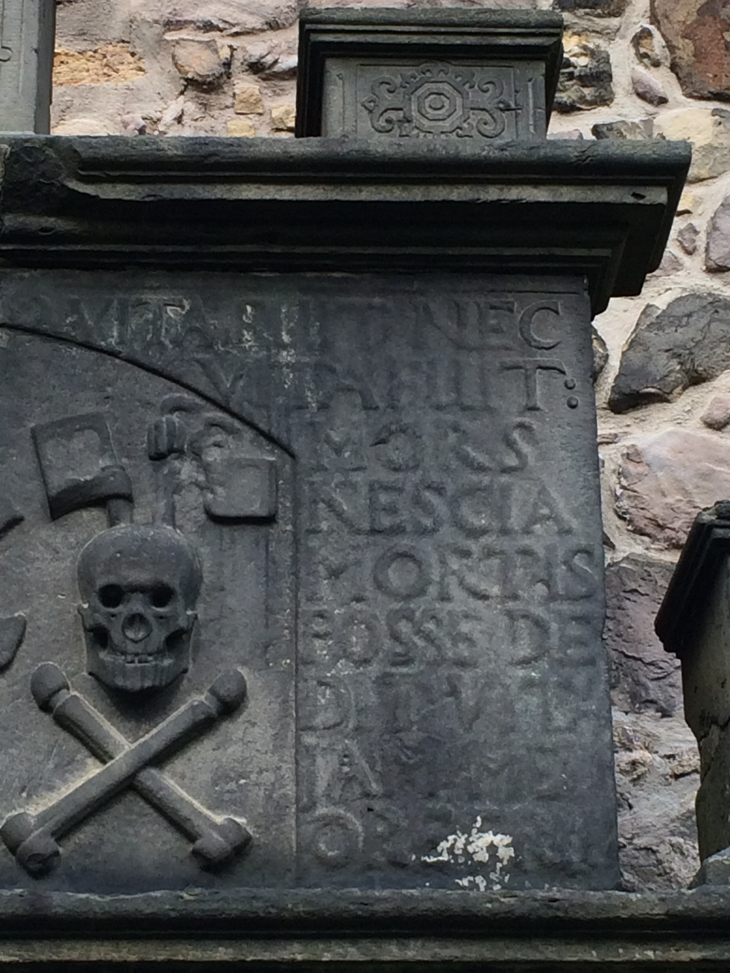 In between the two poems, however, a very different spirit emerges: the top panel of Heriot’s tomb instructs the reader who has understanding to consider one’s origin, one’s current state, and one’s fate: unde sis, quod sis, quidque futurus sis.